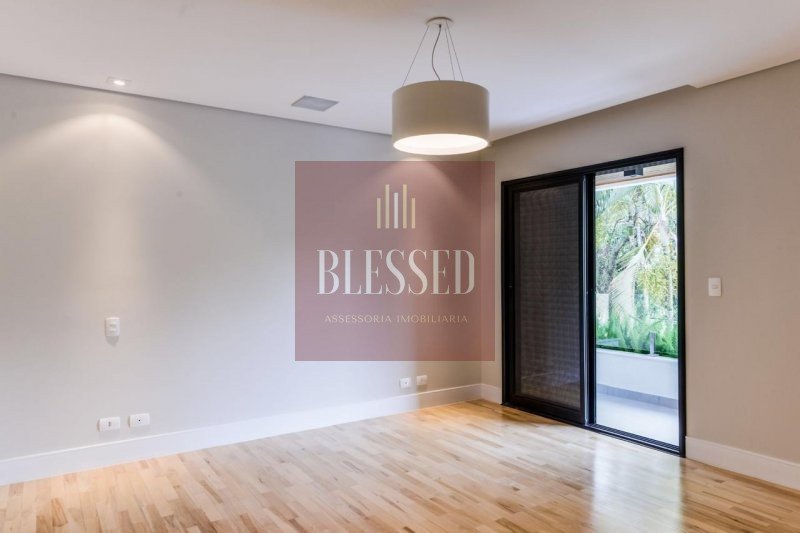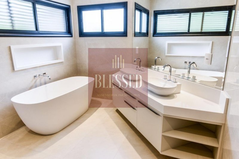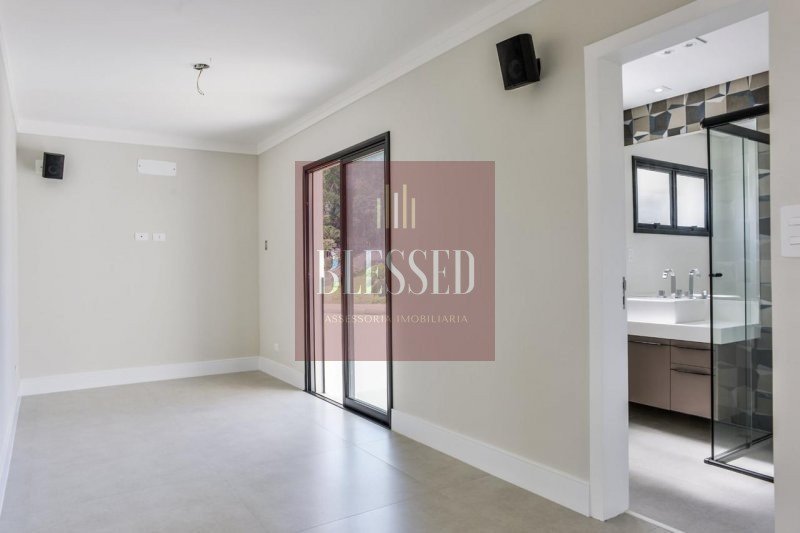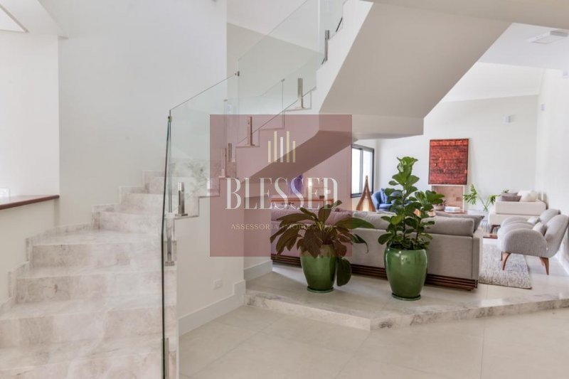 Na área privada, no pavimento superior, com piso de madeira, há uma copa de apoio para as 4 suítes, sendo 2 com closet e sacada, além da master, ampla, que também contém sacada, closet com marcenaria Florense e sala de banho, com banheira de imersão feita de minerais naturais, duchas de teto e cubas duplas.