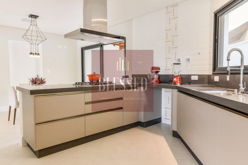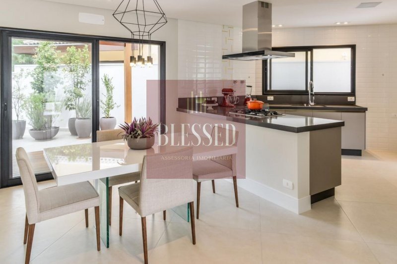Integração da copa e cozinha (com copa), sala de jantar e área gourmet, com churrasqueira e pia. A cozinha está equipada com placa de 5 bocas e exaustor Elettromec , carpintaria Florense e bancada Silestone Marengo. Junto ao vidro encontra-se um jardim sensorial, com árvores de fruto e especiarias, e uma pérgula para um café ou uma refeição ao ar livre.